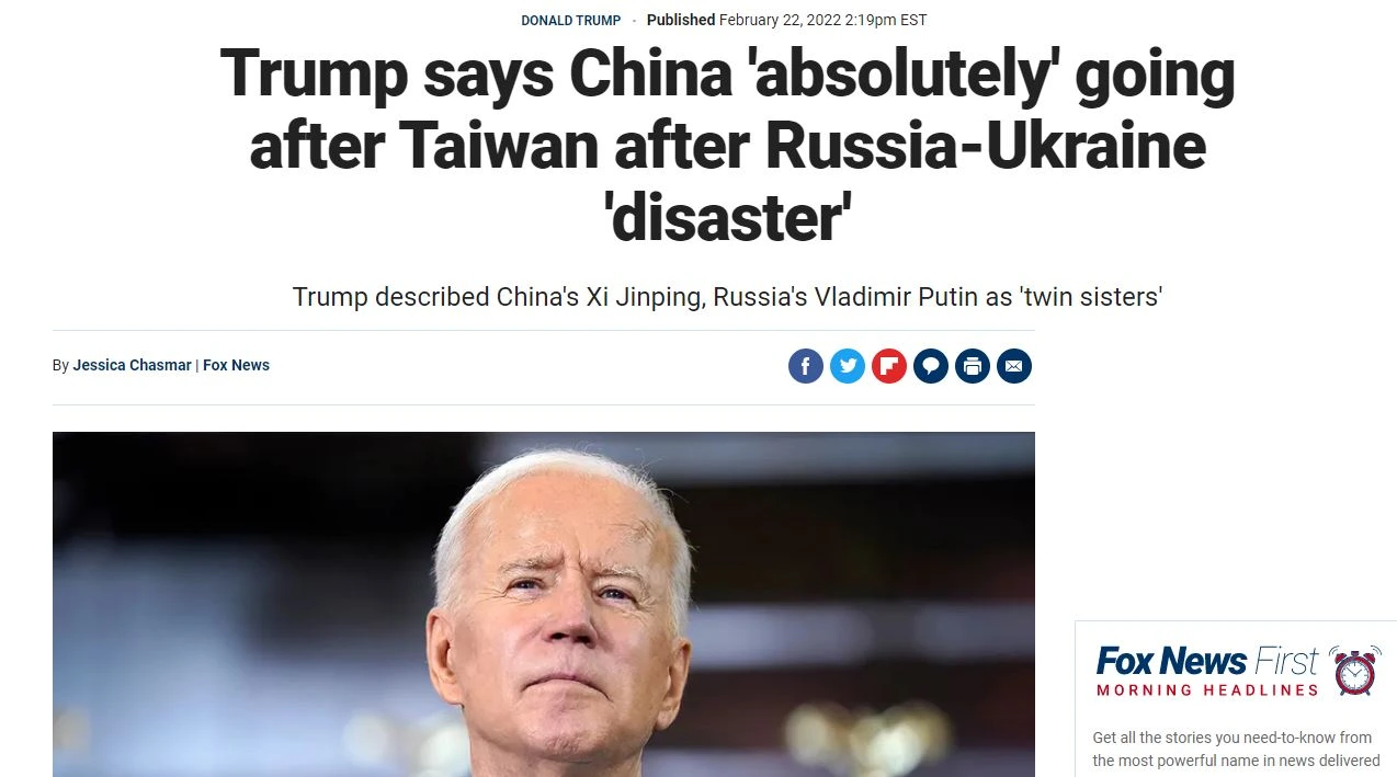دونالد ترامپ: رۇسىيەنىڭ تاجاۋۇزىدىن كېيىن خىتاي مۇتلەق ھالدا تەيۋەنگە ھۇجۇم قوزغايدۇيۈسۈپجان ئۇيغۇر ئاگېنتلىقى 2022-يىلى 23-فېۋرالفوكۇس تېلېۋىزىيە تورىنىڭ خەۋەر قىلىشىچە، سەيشەنبە كۈنى...