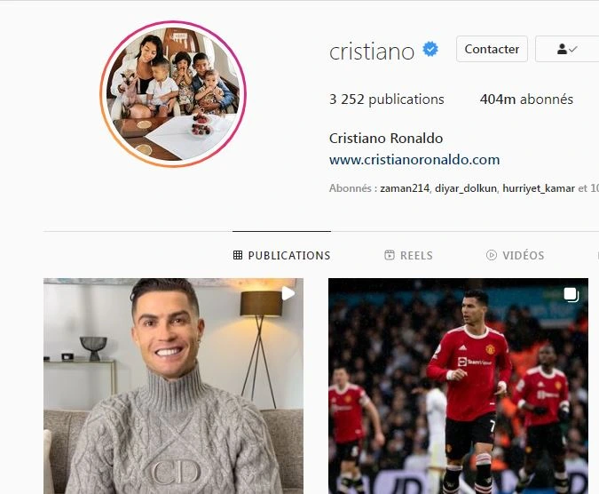تۇرسۇنجانئۇيغۇر ئاگېنتلىقى 2022-يىلى 21-فېۋرالدۇنياۋى پۇتبول چولپىنى كېرستئانو رونالدونىڭ ئىنستاگرام ھېساباتى ئەگەشكۈچىلىرى 400 مىليوندىن ئشىپ، دۇنيادىكى ئەڭ ئالقىشقا ئېرىشكەن شەخس بولۇپ...
