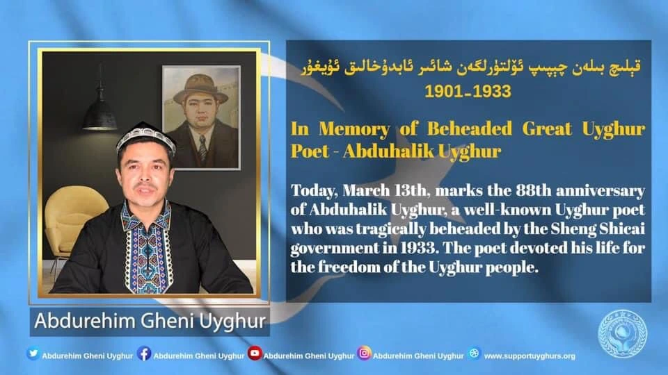 قىلىچ بىلەن چېپىپ ئۆلتۈرۈلگەن شائىر ئابدۇخالىق ئۇيغۇرنى ئەسلەيمەن ئابدۇرېھىم غېنى ئۇيغۇر بۈگۈن يەنى 3-ئاينىڭ 13-كۈنى ھاياتىنى ئۇيغۇر خەلقىنىڭ ئەركىنلىكى ئۈچۈن...