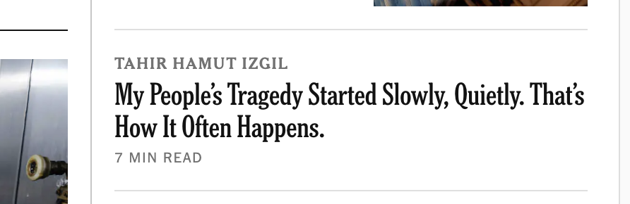 ئۇيغۇر شائىرى تاھىر ھامۇت ئىزگىلنىڭ ئامېرىكىنىڭ نوپۇزلۇق ئاخبارات ۋاستىسى نيۇيورك ۋاقىت گېزىتىدە «مىنىڭ ۋەتىنىمدىكى تېراگىدىيە بىر دەرس بولسۇن! (ئۇيغۇرلارنىڭ...