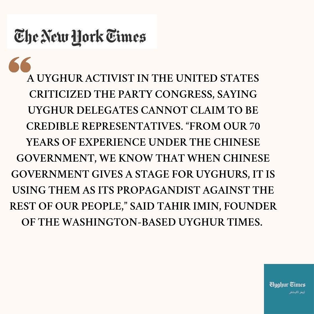 تاھىر ئىمىن «نيۇ-يورك ۋاقىت گېزىتى»گە: كومپارتىيە قۇرۇلتىيىدىكى ئۇيغۇرلار ھەقىقىي ئۇيغۇر مىللىتىگە ۋەكىللىك قىلالمايدۇ ئۇيغۇر مۇخبىر ئۇيغۇر ئاگېنتلىقى 2022-يىلى 17-ئۆكتەبىر خىتاي...