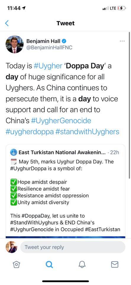 ئۇيغۇر ئاگېنتلىقى، 2021- يىلى 5- ماي فوكس تېلېۋزىيەسى خەۋەرلىرى داڭلىق مۇخبىرى بىنجامىن خال تۋىتتېردا دوپپا بايرىمىغا ئائىت رەسمنى ئورتاقلىشپ،...