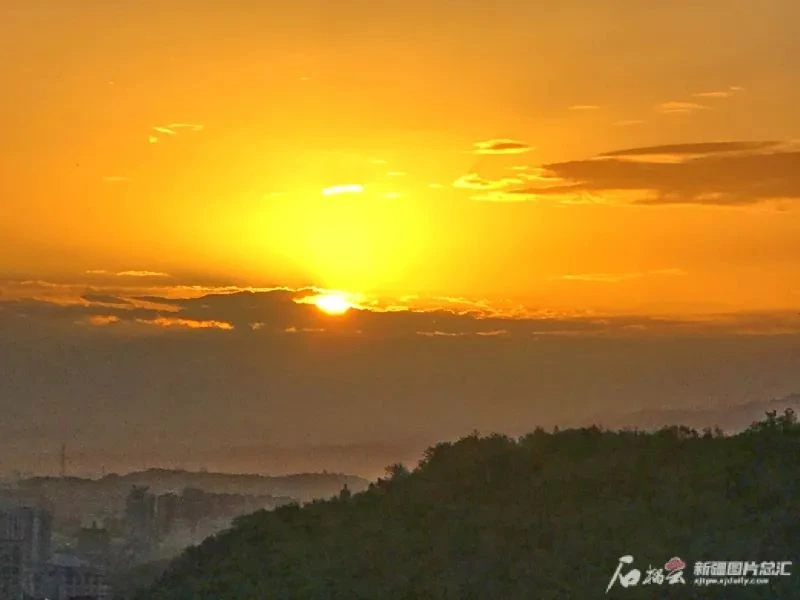 سۈرەت: 24-ئىيۇل ئەتىگەن، ئۈرۈمچى شەھىرىدىكى يامالىق تېغى باغچىسى. ئالتۇن رەڭلىك قۇياش ئۇپۇقتىكى بۇلۇت قاتلىمىدىن بۆسۈپ چىقماقتا ختتتاينىڭ...