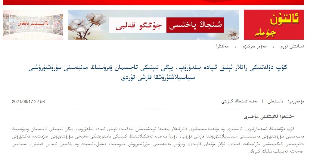ئارمان ئۇيغۇر ئاگېنتلىقى 2021-يىلى 19-ئاۋغۇستخىتاي ئورگان تەشۋىقات تورى تەڭرىتاغ تورى 17- ئاۋغۇست " كۆپ دۆلەتتىكى زاتلار ئېنىق ئىپادە بىلدۈرۈپ، يېڭى...