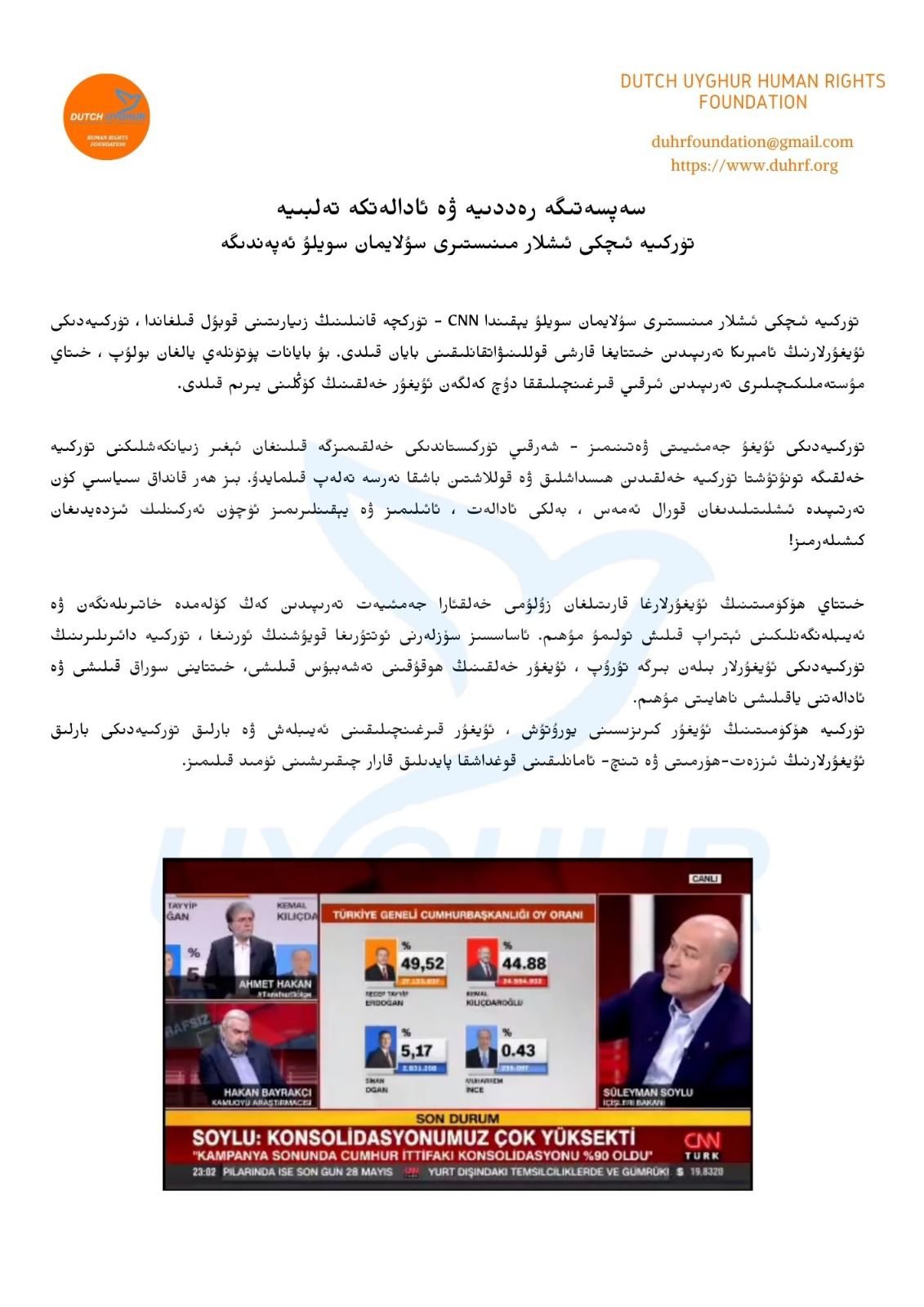 ئۇيغۇر ئامېرىكا جەمئىيىتى تۈركىيەنىڭ ئىچكى ئىشلار مىنىستىرى سۇلايمان سويلۇنىڭ 22-ماي CNN Türkiye نىڭ زىيارىتىنى قوبۇل قىلغاندا،خەلقىمىز دۇچ كېلىۋاتقان دەھشەتلىك...